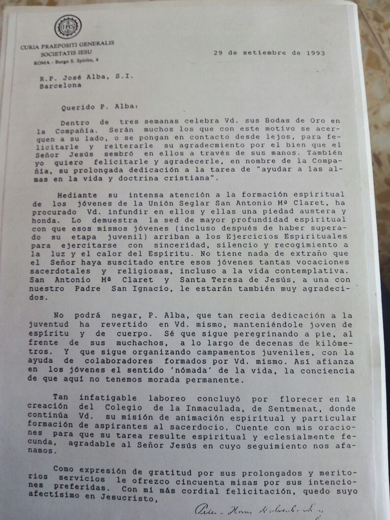 Dentro de tres semanas celebra Vd.sus Bodas de Oro en la Compañía. Serán muchos los que con este motivo se acercarán a su lado, o se pongan en contacto desde lejos, para felicitarle y reiterarle su agradecimiento por el bien que el Señor Jasús sembró en ellos a través de sus manos. También yo quiero felicitarle y agradecerle, en nombre de la Compañía, su prolongada dedicación a la tarea de "ayudar a las almas en la vida y doctrina cristiana".